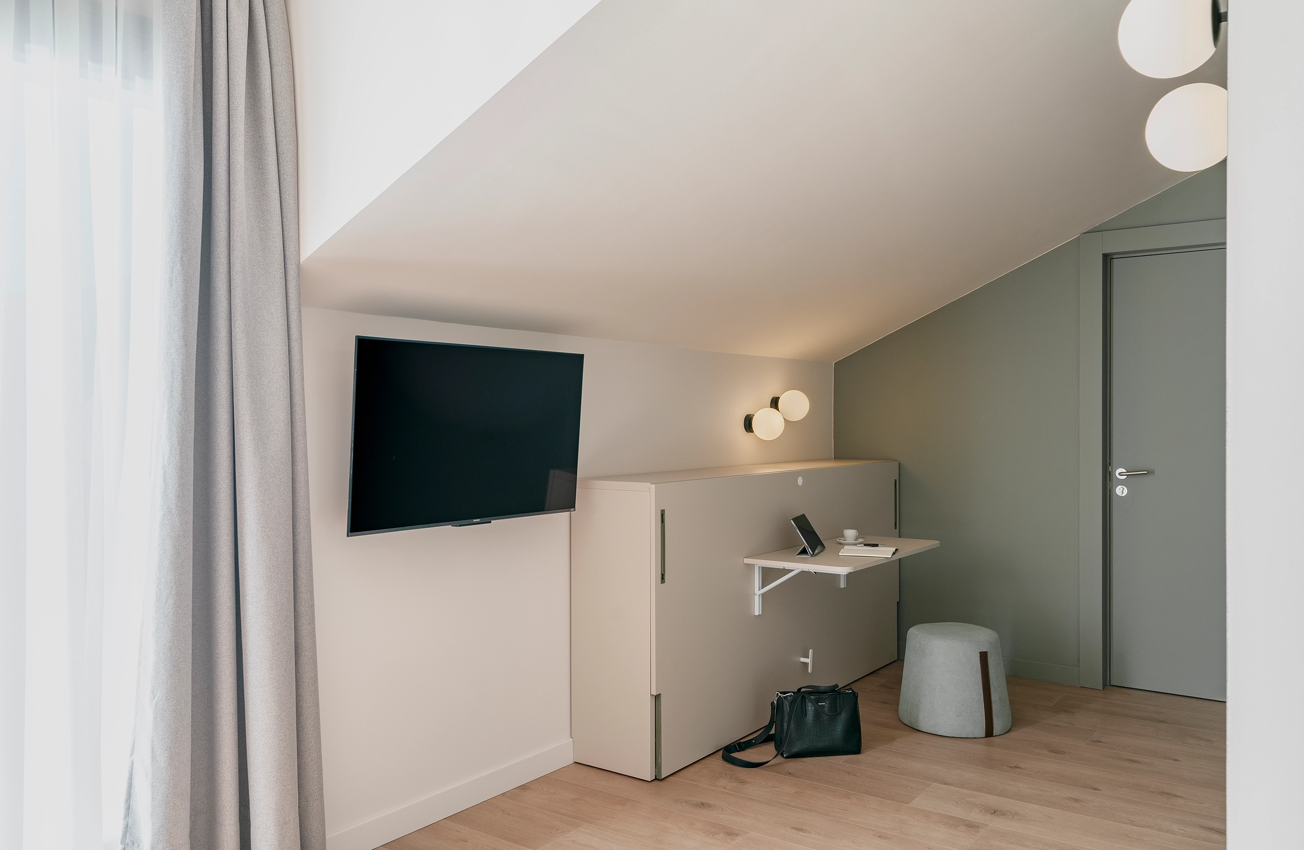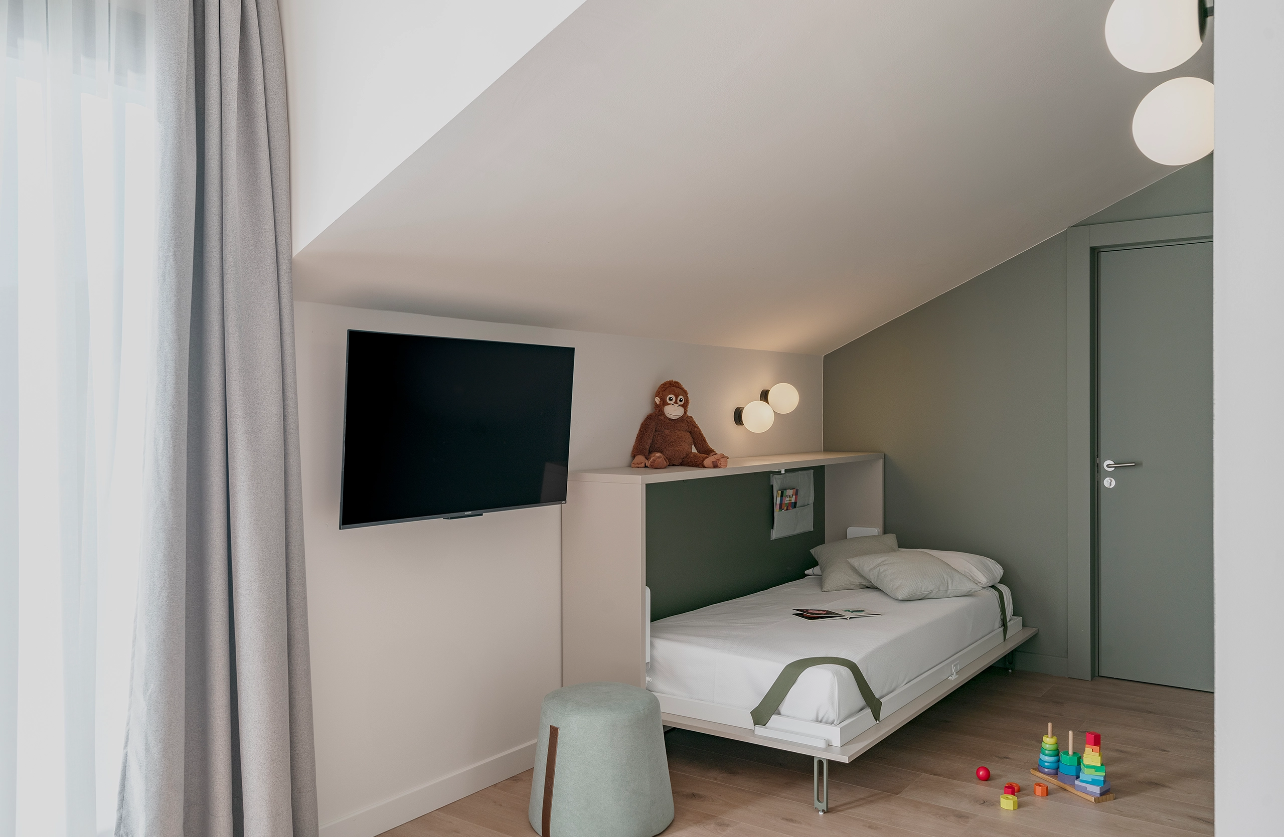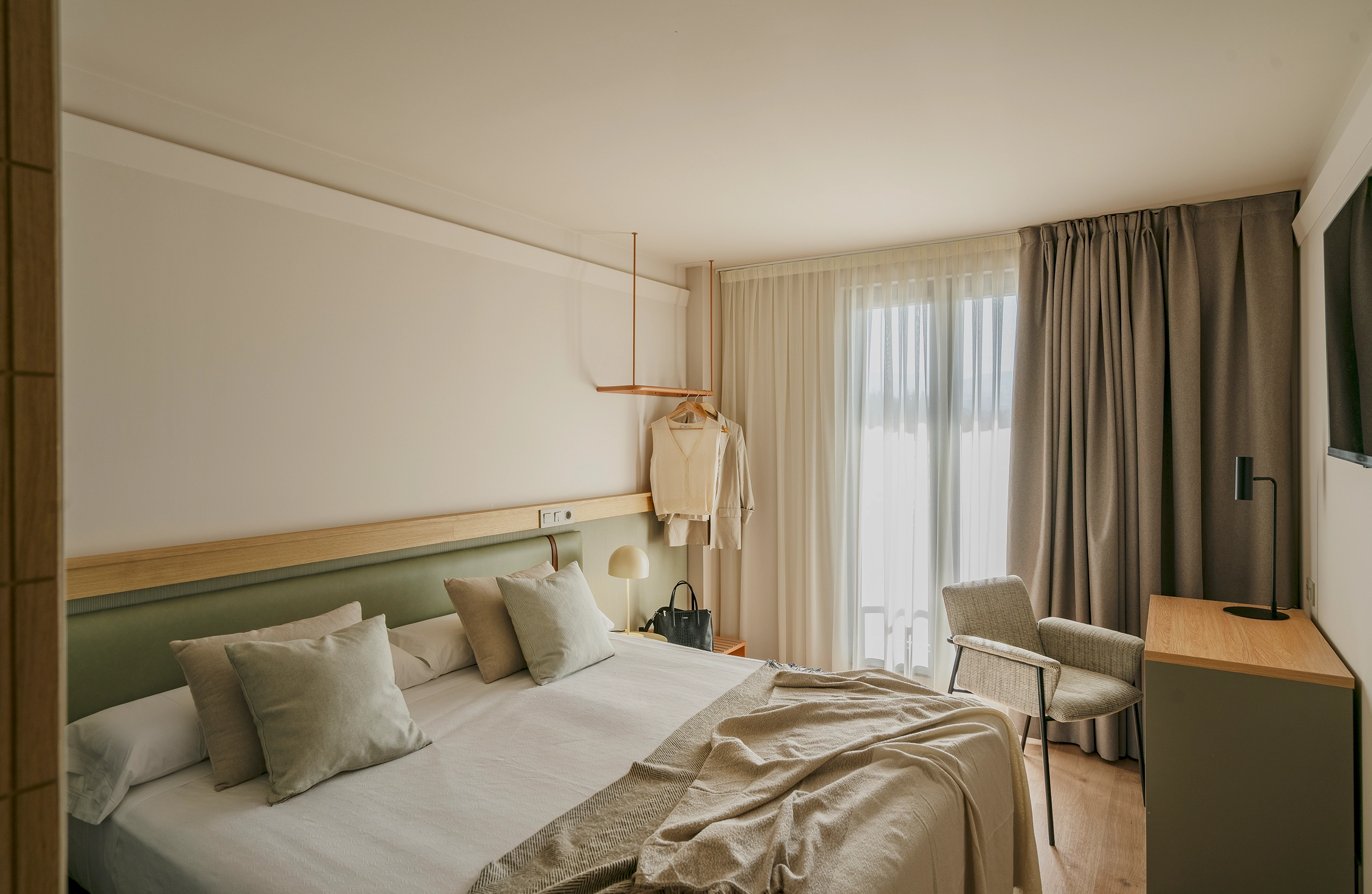 Por todo ello, los Valles Pasiegos, el paisaje y el agua sirven de inspiración en la renovación de este espacio del Grupo Los Pasiegos. El verde de sus prados, la niebla, el agua y la idea de la cabaña como refugio dan como resultado la paleta de colores y el espíritu general del hotel.
