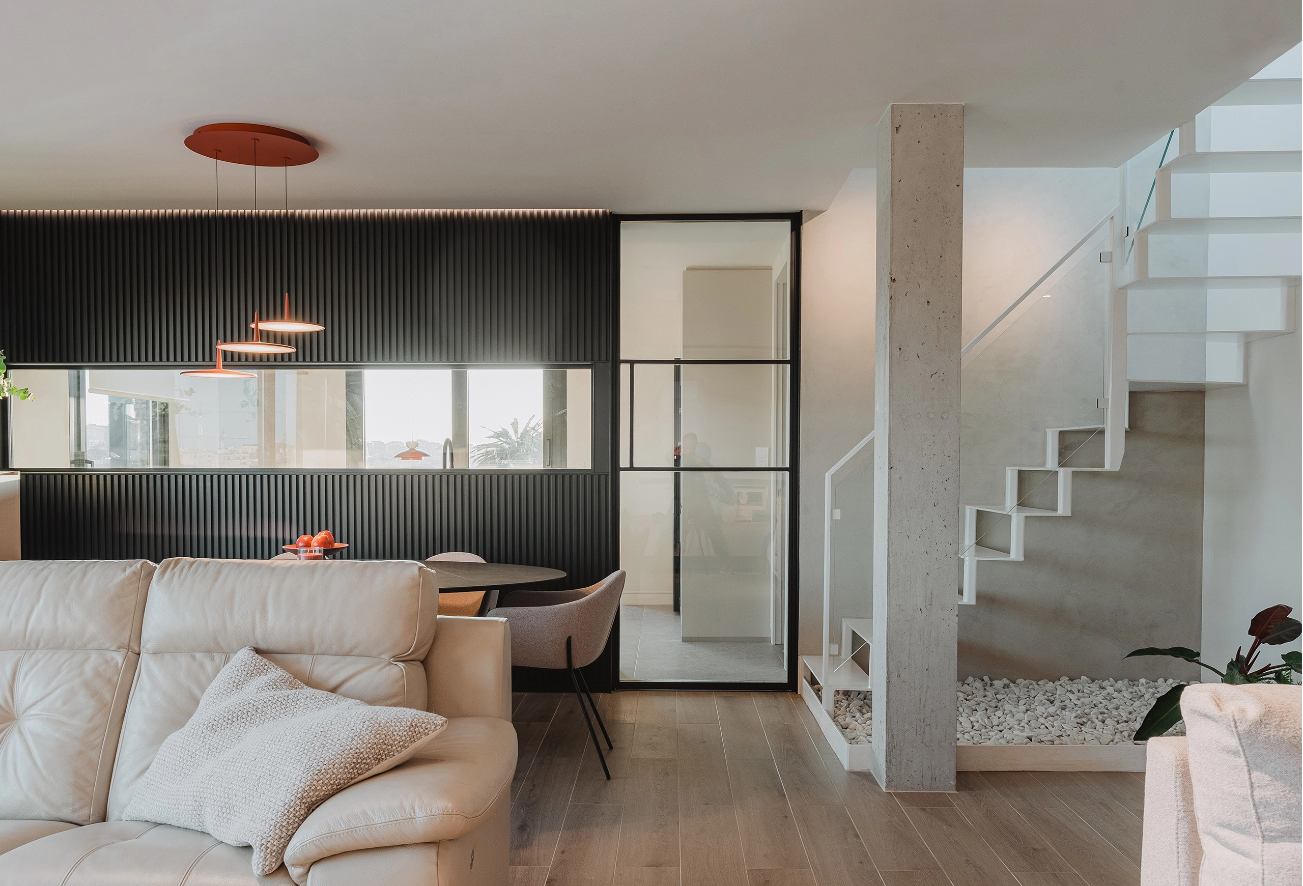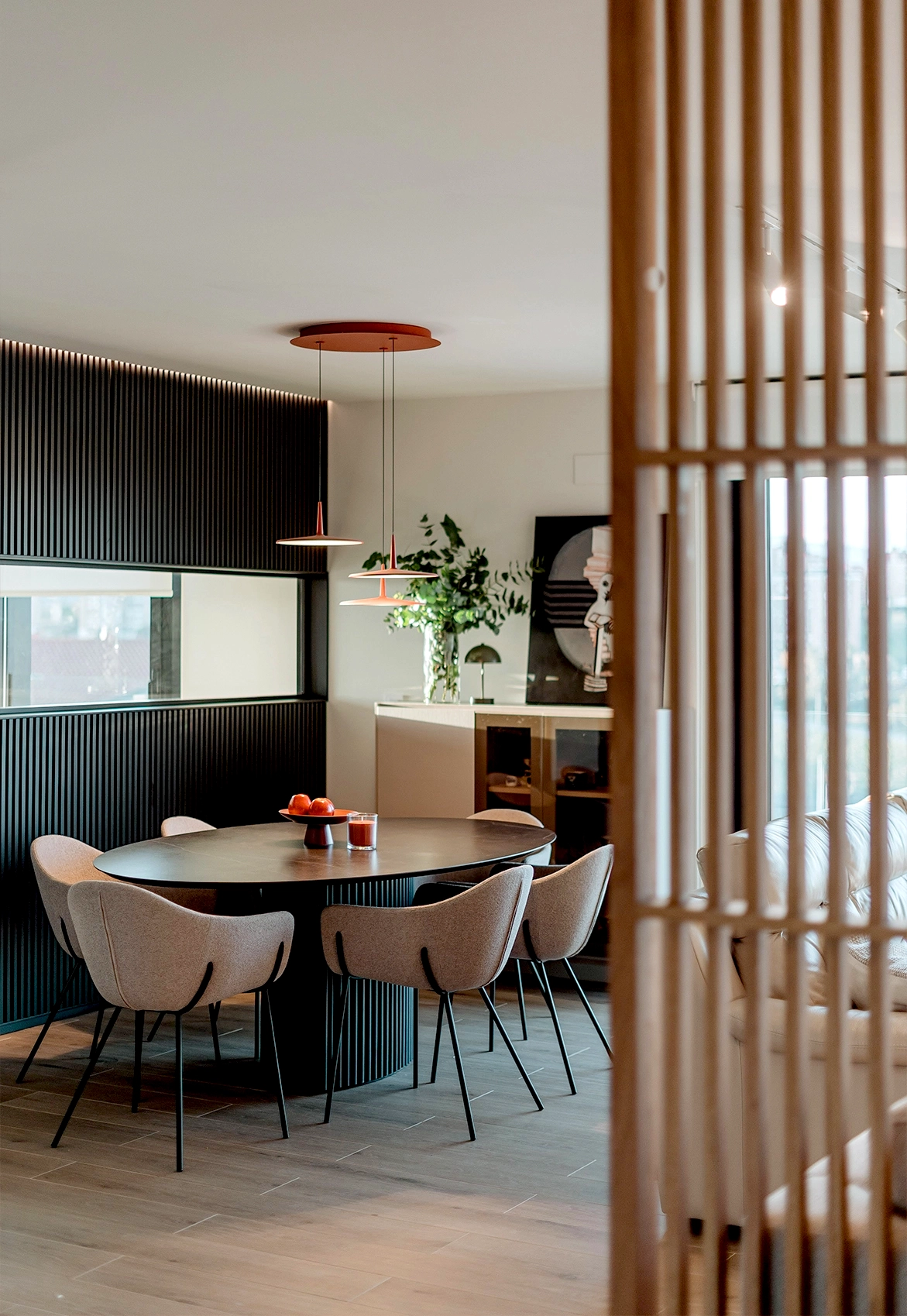 A la vivienda se accede por un vestíbulo cuidadosamente diseñado donde nos recibe una imponente celosía de madera de roble maciza que deja entrever el corazón de la casa: la conexión entre cocina y comedor.