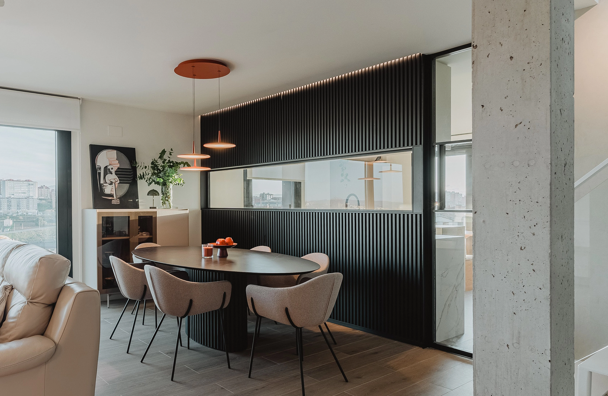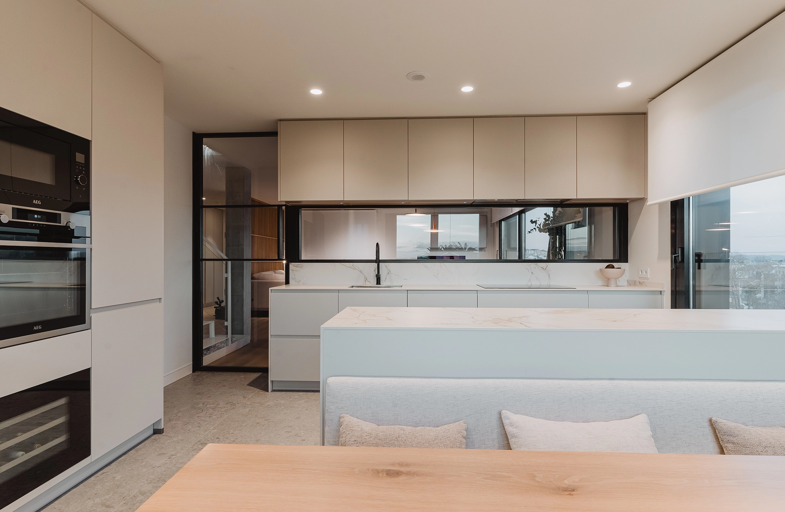 Desde su interior, el gran ventanal que recorre toda la encimera permite a sus dueños cocinar sin perder de vista lo que ocurre en el comedor, a la vez que enmarca las vistas de la ciudad con la playa del Sardinero al fondo.