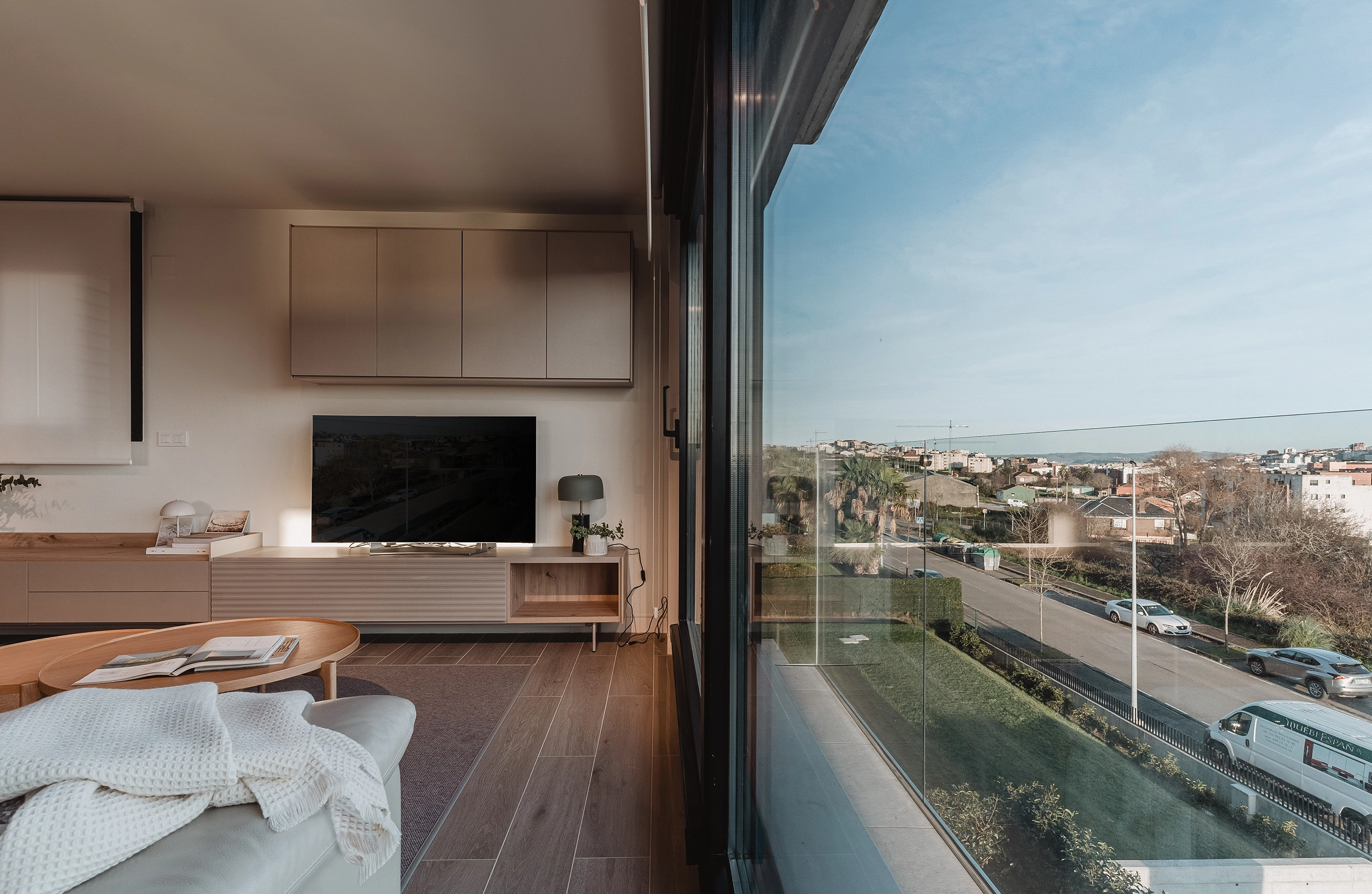 La separación entre ambos espacios se diluye gracias a un gran ventanal horizontal y una puerta de vidrio de suelo a techo que permiten una vista fluida entre ambas zonas. Un diálogo entre vidrio y madera para conseguir un conjunto de líneas puras que esconde complejas soluciones constructivas, cuidadas al milímetro.