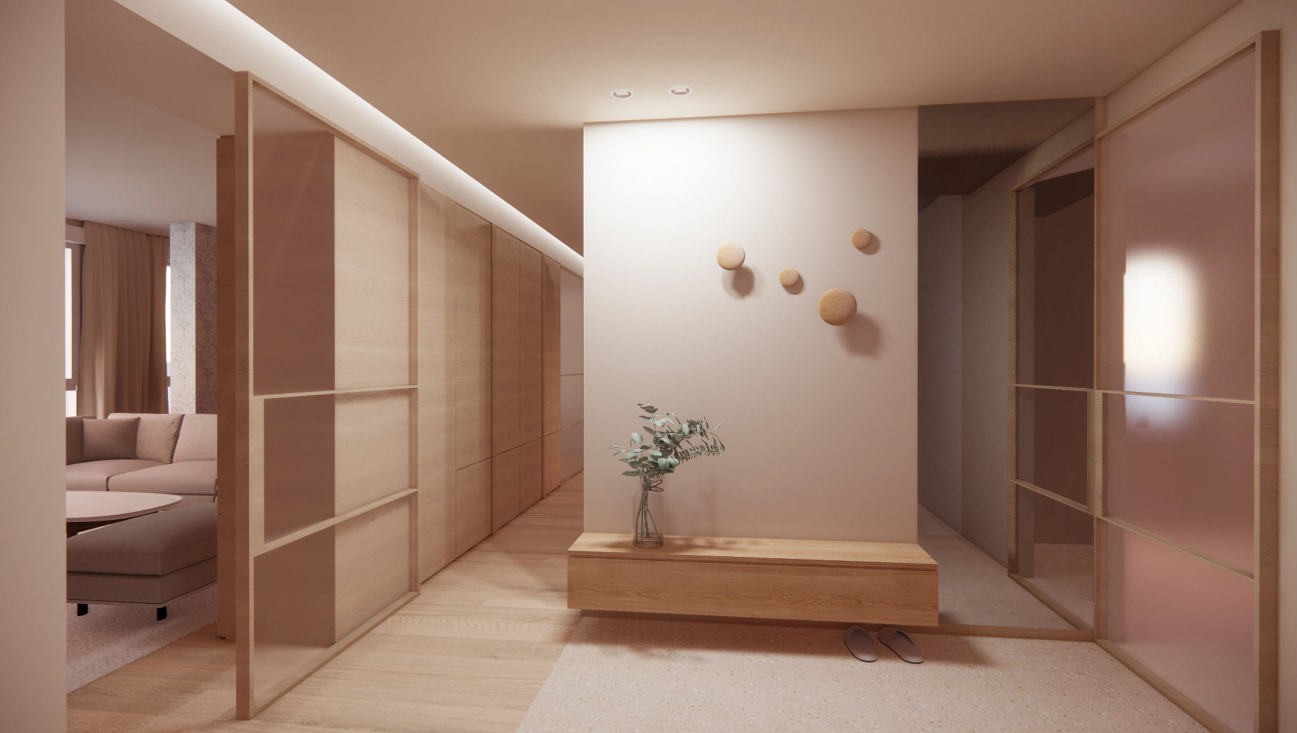 Por otro lado, convertimos el almacenaje y el pasillo en protagonistas de la vivienda. Este espacio, inevitable en la distribución, pasa de ser un lugar oscuro a convertirse en el eje vertebrador de la vida, haciéndose permeable, abriéndose o cerrándose según las necesidades, y albergando el máximo almacenamiento posible.